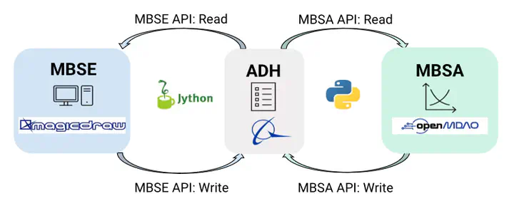Model-Based Systems Analysis & Engineering Coupling FrameworkIndustry’s embrace of digital engineering practices permits engineers from different teams (and possibly geographic locations) to collaboratively synthesize complex system architectures. These efforts are supported by the complementary use of Model-Based Systems Engineering (MBSE) and Model-Based Systems Analysis (MBSA) tools. However, coupling these tools together leads to conflicting sources of truth - MBSE holds system-level design requirements and parameters, while MBSA holds subsystem- and component-level ones - a critical gap that must be addressed. We developed a framework and open-source API to couple MBSE-MBSA tools using a centralized data schema, which acts as an interface between all systems engineering and disciplinary analysis tools. The framework facilitates information mapping between the central data schema and each tool, enabling different design tools to be flexibly coupled as the design advances. A demonstration of the framework is performed in the context of supporting NASA’s Sustainable Flight National Partnership by importing and modifying data in a MagicDraw Systems of Systems Architect model. It is shown that coupling the MBSE and MBSA tools with a centralized data schema facilitates seamless data transfer while minimizing an organization’s overhead costs to pursue more interconnected workflows within an emergent digital ecosystem.